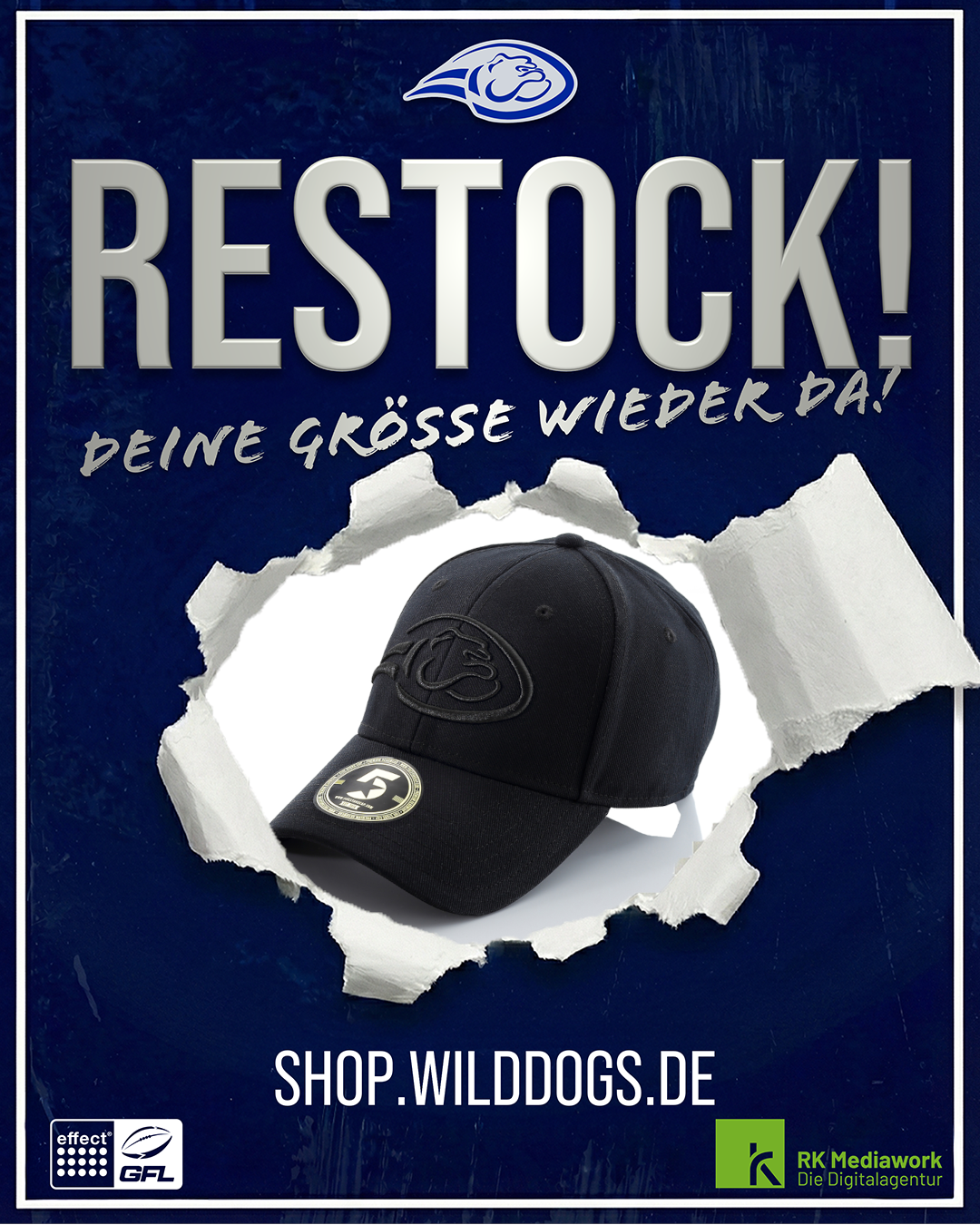 Die komplett in Schwarz gehaltene Cap ist ab sofort in einer ersten Auflage verfügbar. Ihr könnt euch euer Exemplar entweder bequem über unseren Online-Shop unter shop.wilddogs.de sichern oder direkt bei unserem Merchandising-Stand im Stadion zuschlagen.